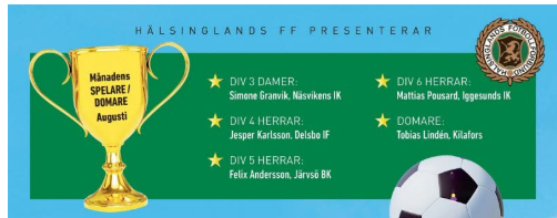 Vår Mattias Pousard har av Hälsinglands Fotbollförbund utsetts till månadens spelare för augisti i division 6. Grattis säger vi till Mattias för den synnerligen välförtjänta utnämningen!
